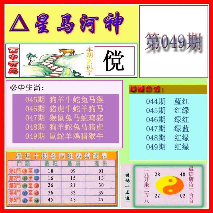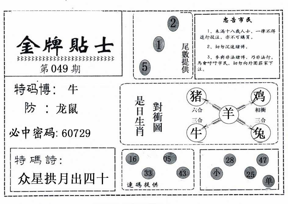 | 049期:⑨肖 | 虎鼠鸡兔猪牛蛇猴羊 | 0 |