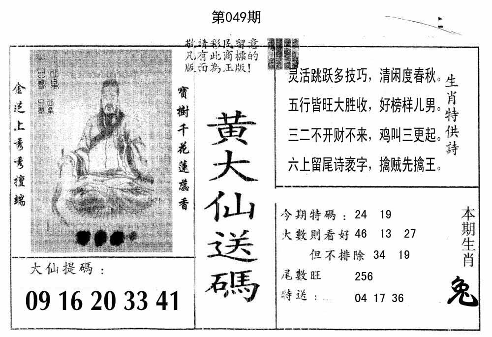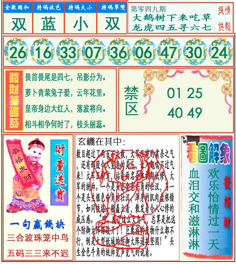 | 049期: 幸运一组三中三→规律①肖①码←7连中 | |