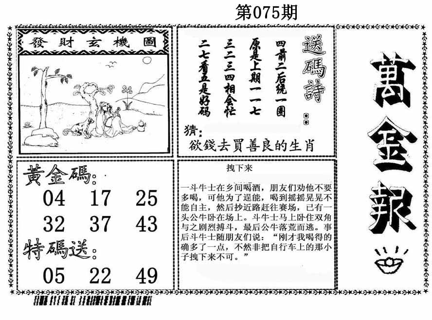 | 075期 | 金牛论坛-单数: 19 31 49 43 41 17 25 21 15 33 05 27 47 01 07 13 37 09 |