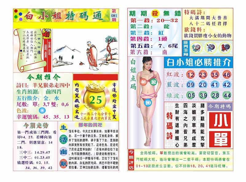 | 080期 :杀46 15 42 38 35 31 27 41 34 21开:羊36 |