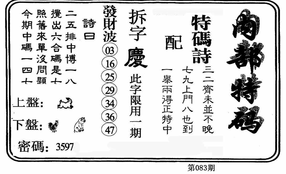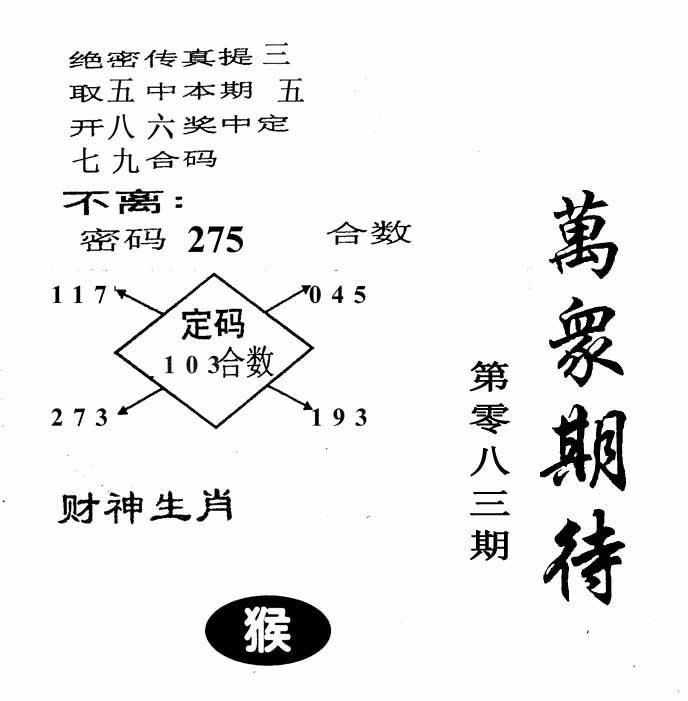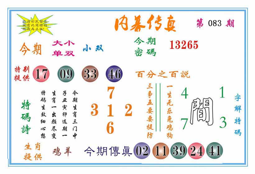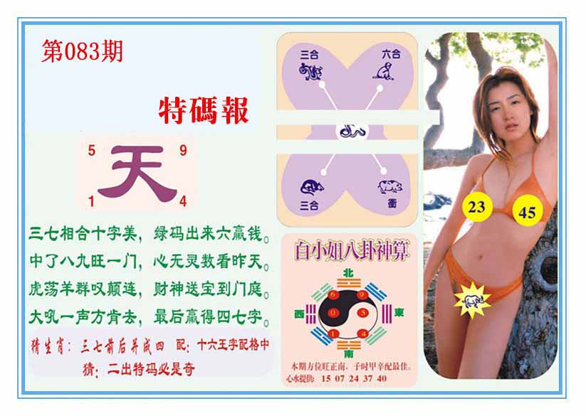 | 083期: 幸运一组三中三→规律①肖①码←7连中 | |