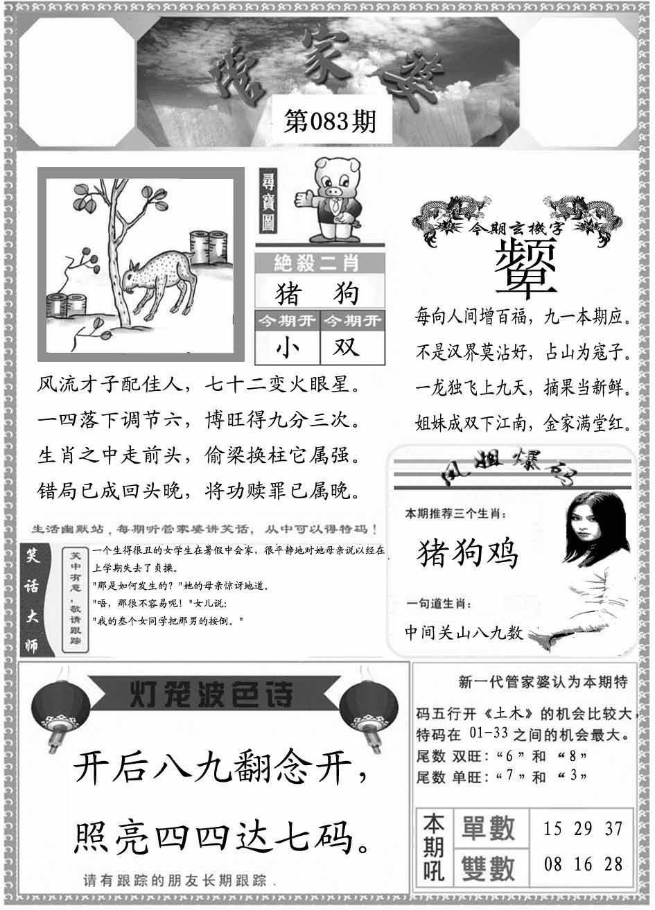 | 082期:⑨肖 | 虎蛇鼠龙狗猴羊兔猪 | 鸡34 |