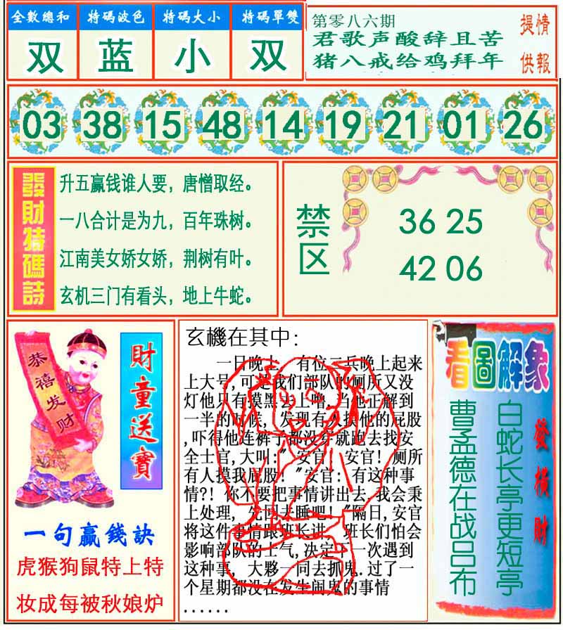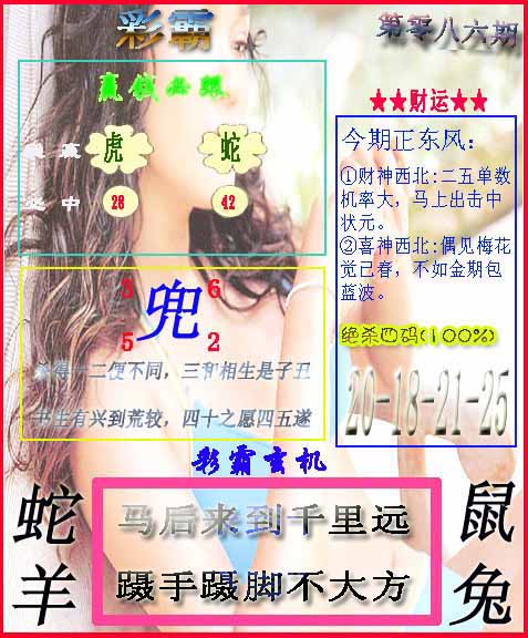 | 086期: 幸运一组三中三→规律①肖①码←7连中 | |