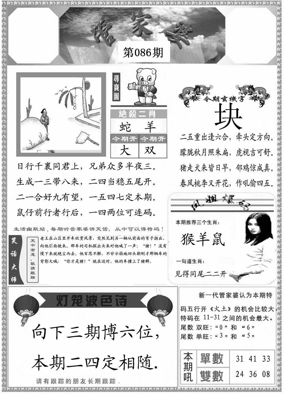 | 086期:【新濠天地】→【灭庄②肖】←值得关注 | |