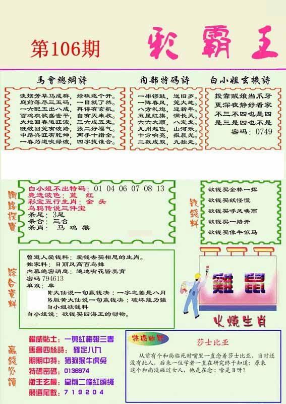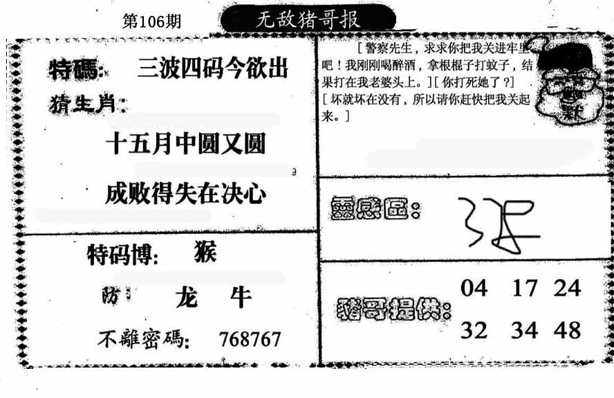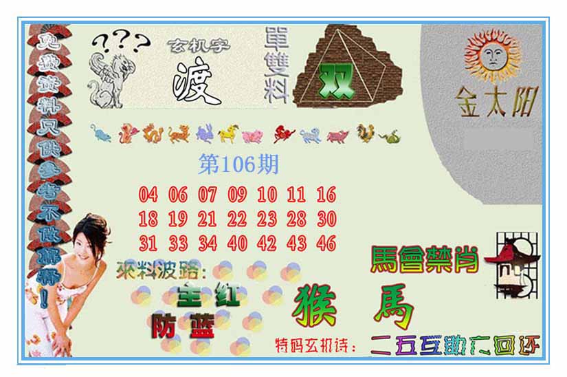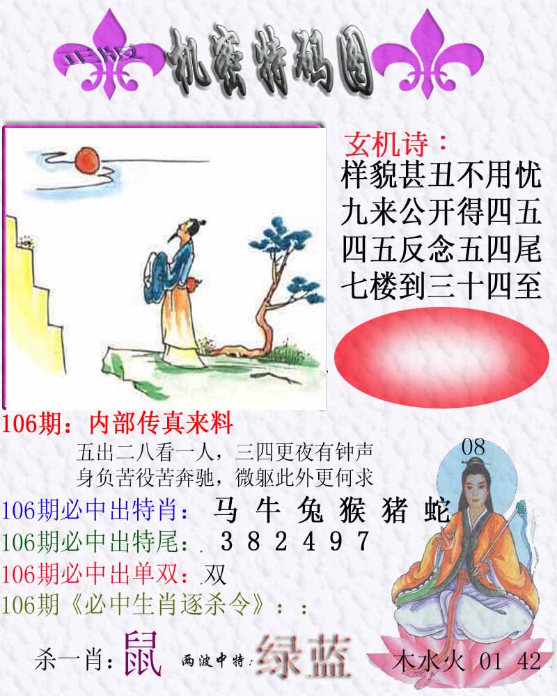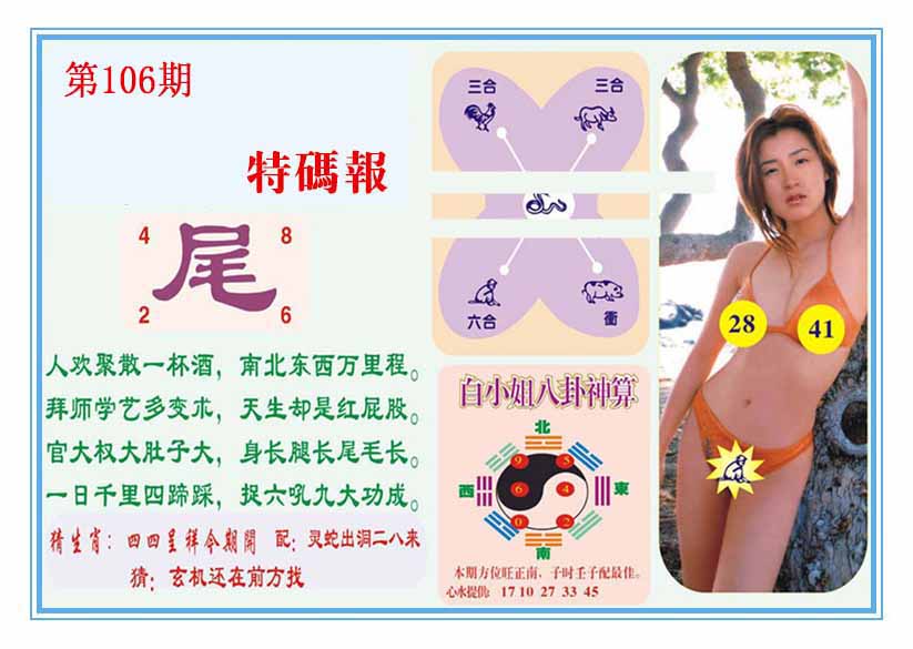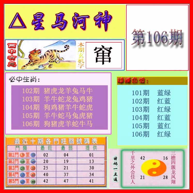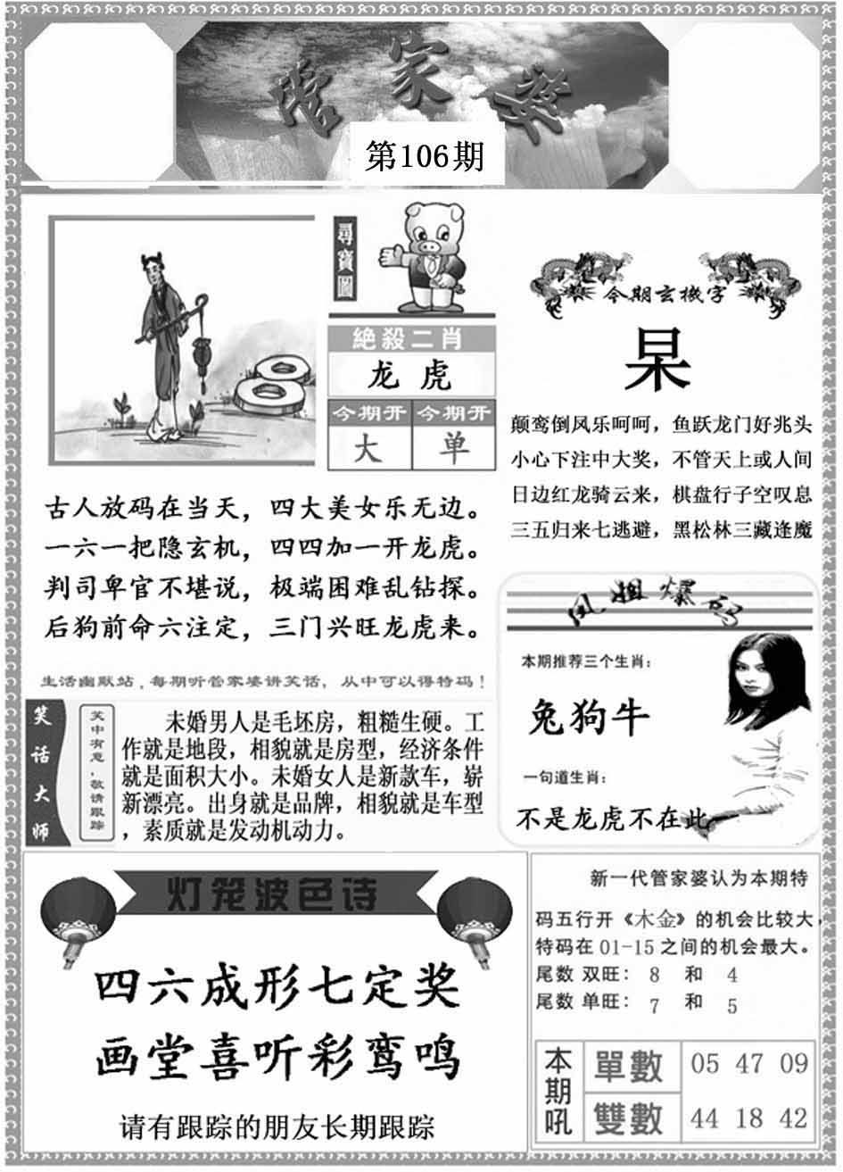 | 106期:⑨肖 | 狗牛龙猴羊虎鼠鸡蛇 | 0 |