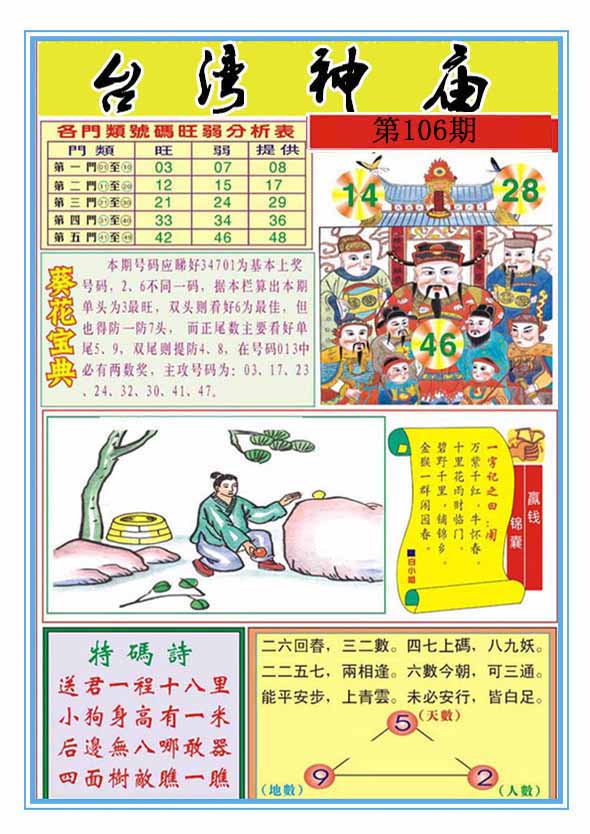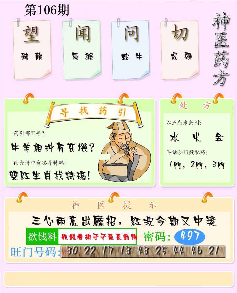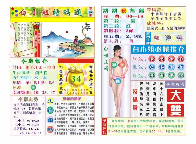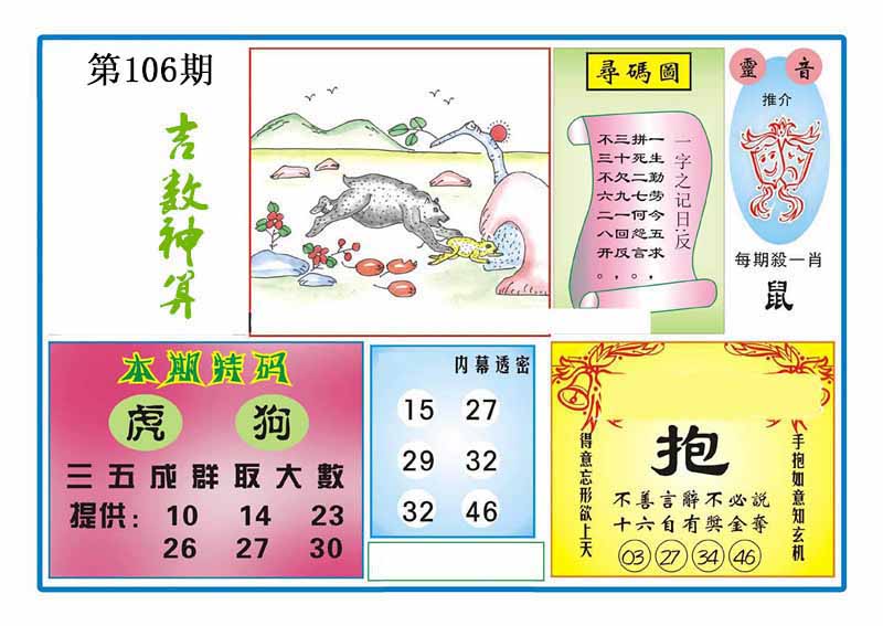 | 105期:⑦肖 | 蛇兔猪羊鼠猴虎 | 鸡46 |