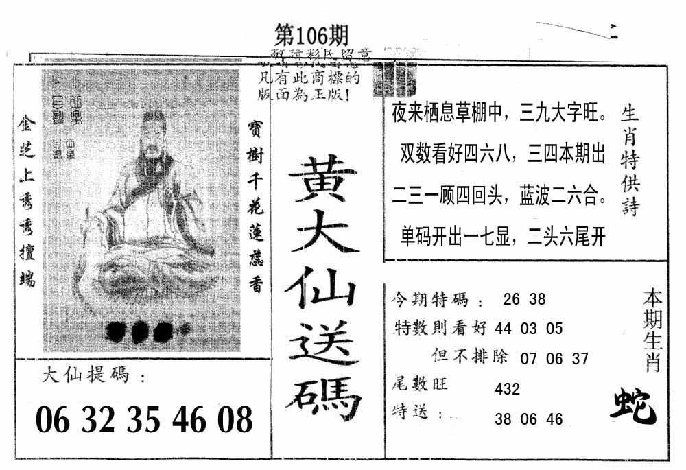 | 105期:⑤肖 | 蛇兔猪羊鼠 | 鸡46 |
