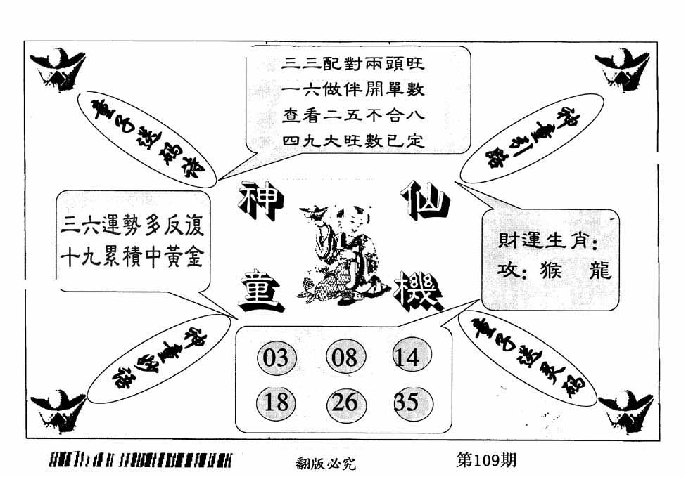 | 108期:⑨肖 | 鼠兔蛇狗鸡羊虎龙猴 | 猴23 |