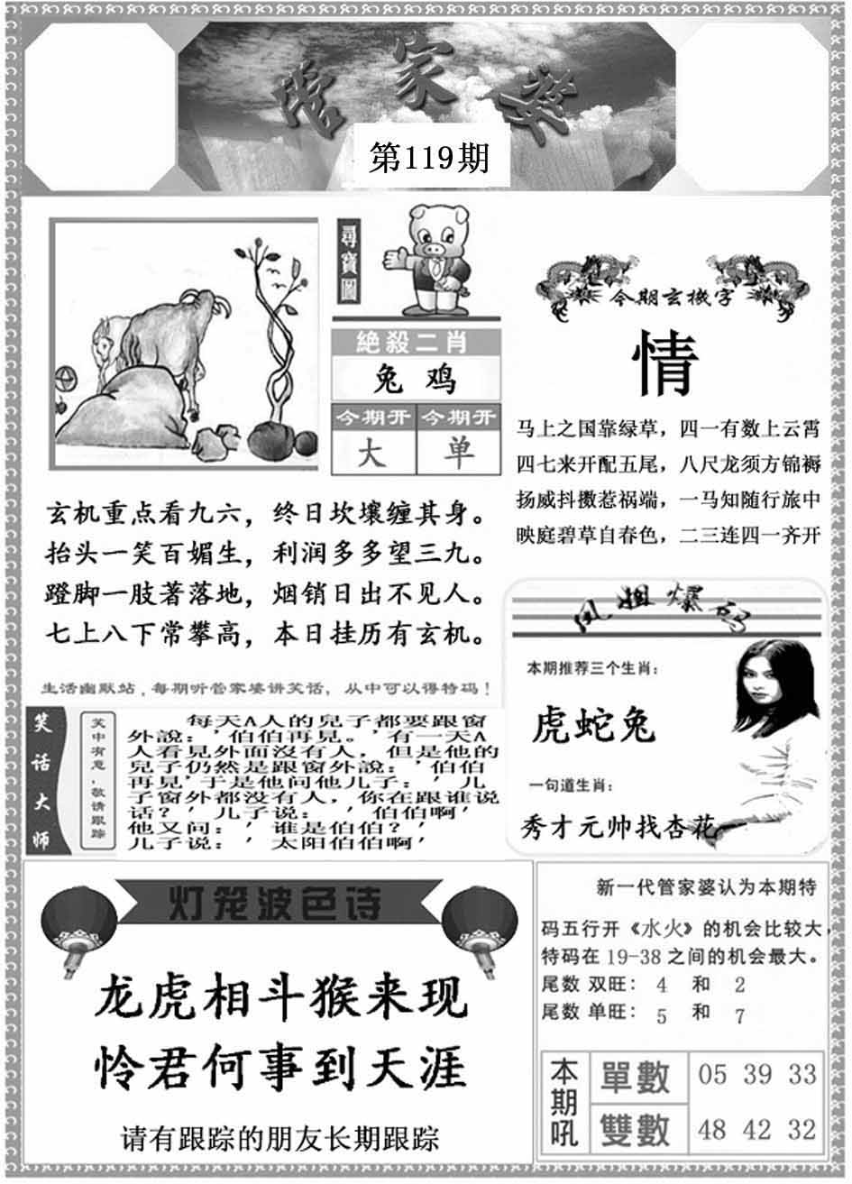 | 116期:⑨肖 | 狗龙牛兔鸡猴马蛇虎 | 虎05 |